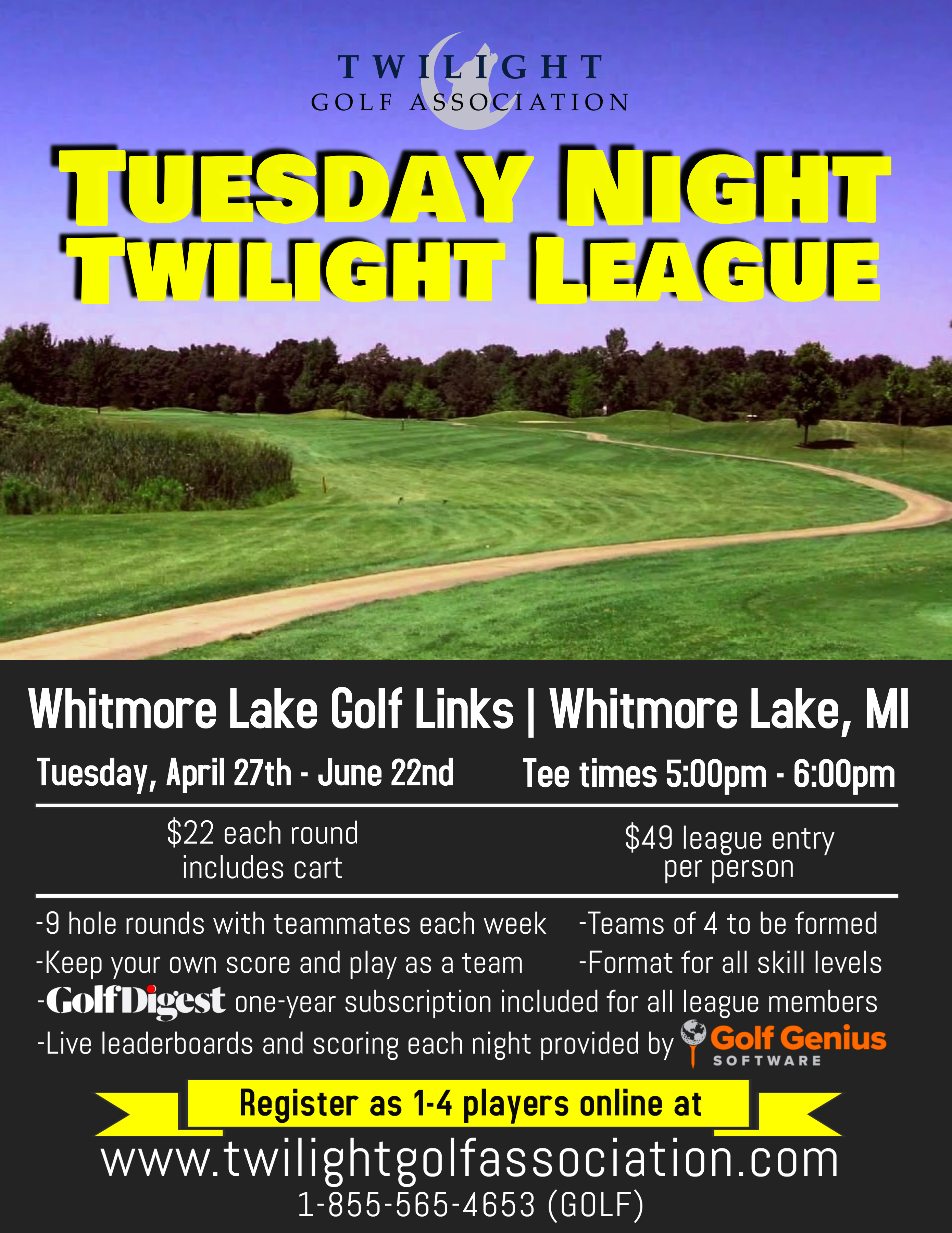 For more information, e-mail play@twilightgolfassociation.com or call 1-855-565-4653 (GOLF)